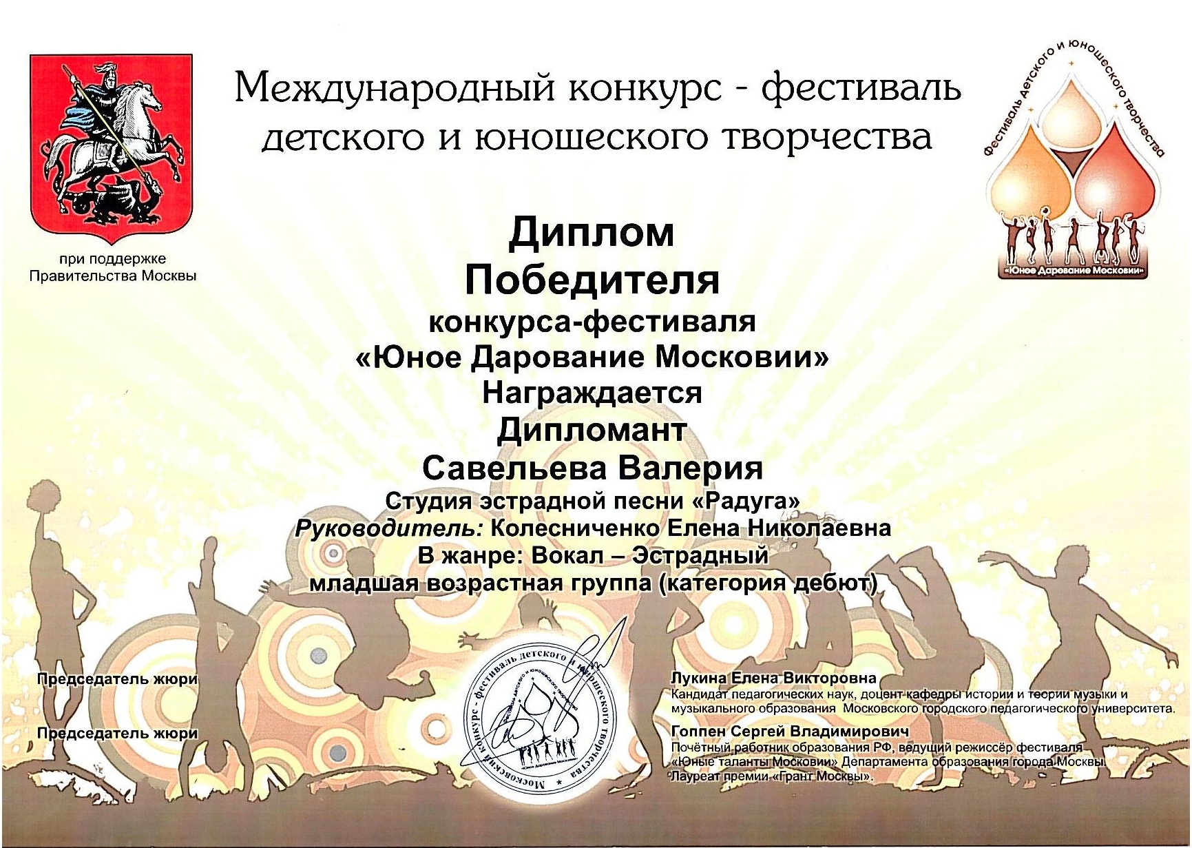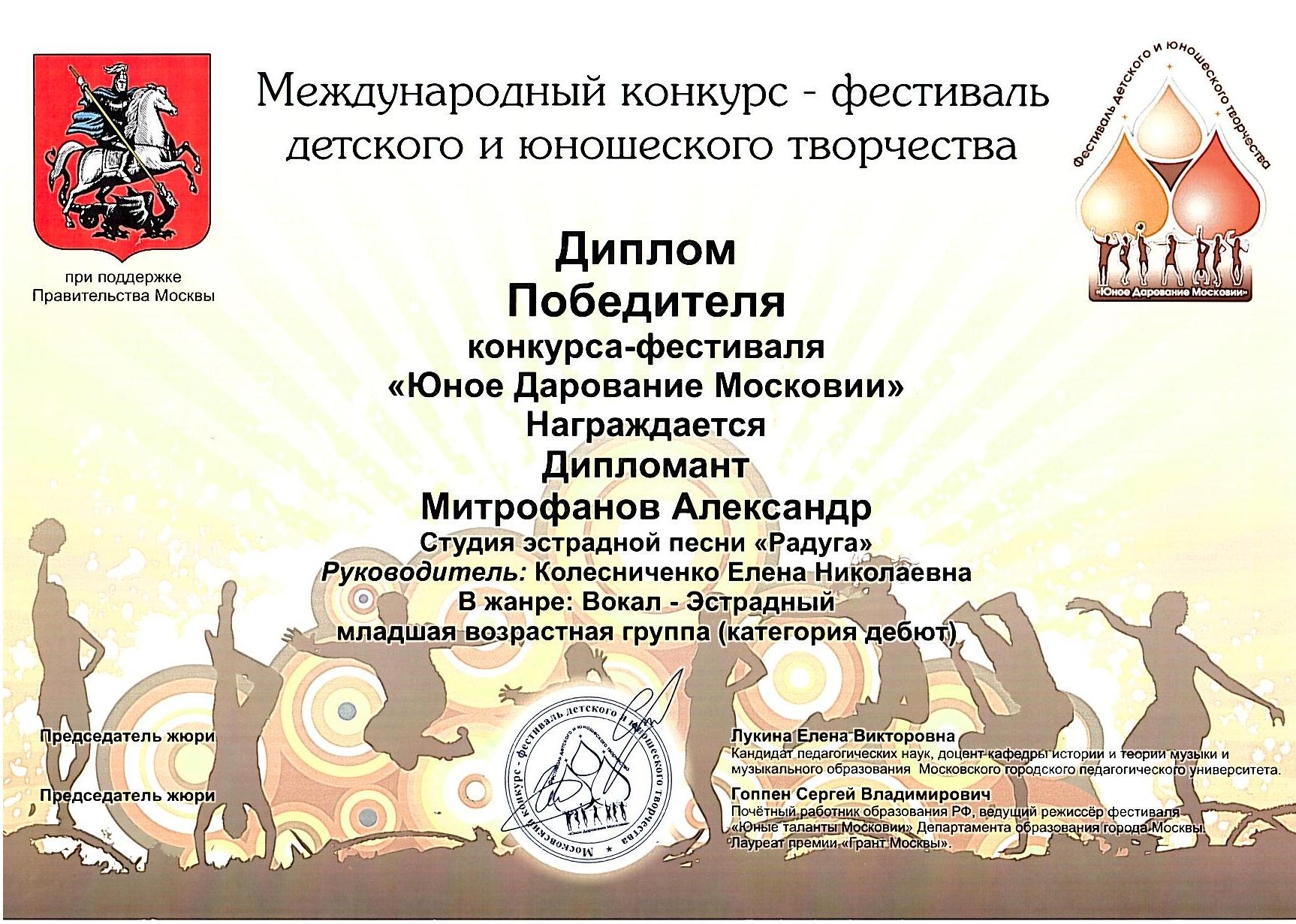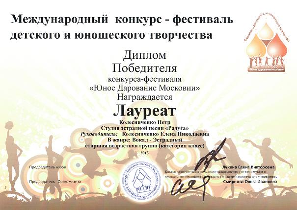 Победитель- Лауреат Международного конкурса "Юное Дарование Московии" Департамента Образования г.Москвы (2013) -Колесниченко Петр