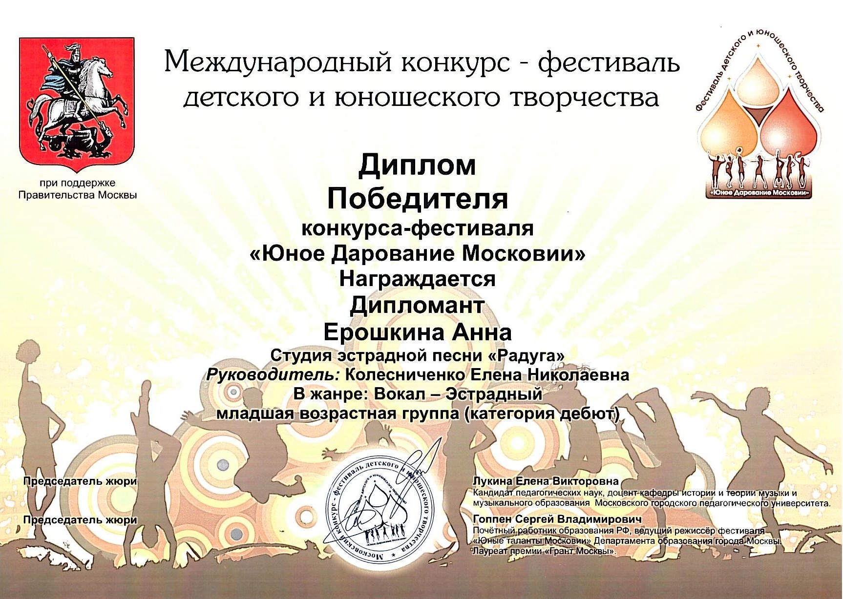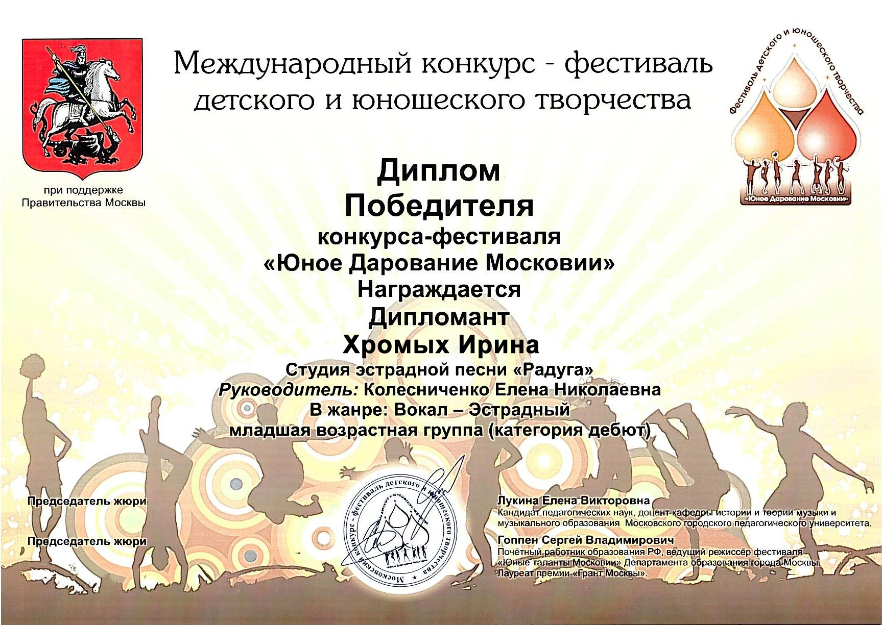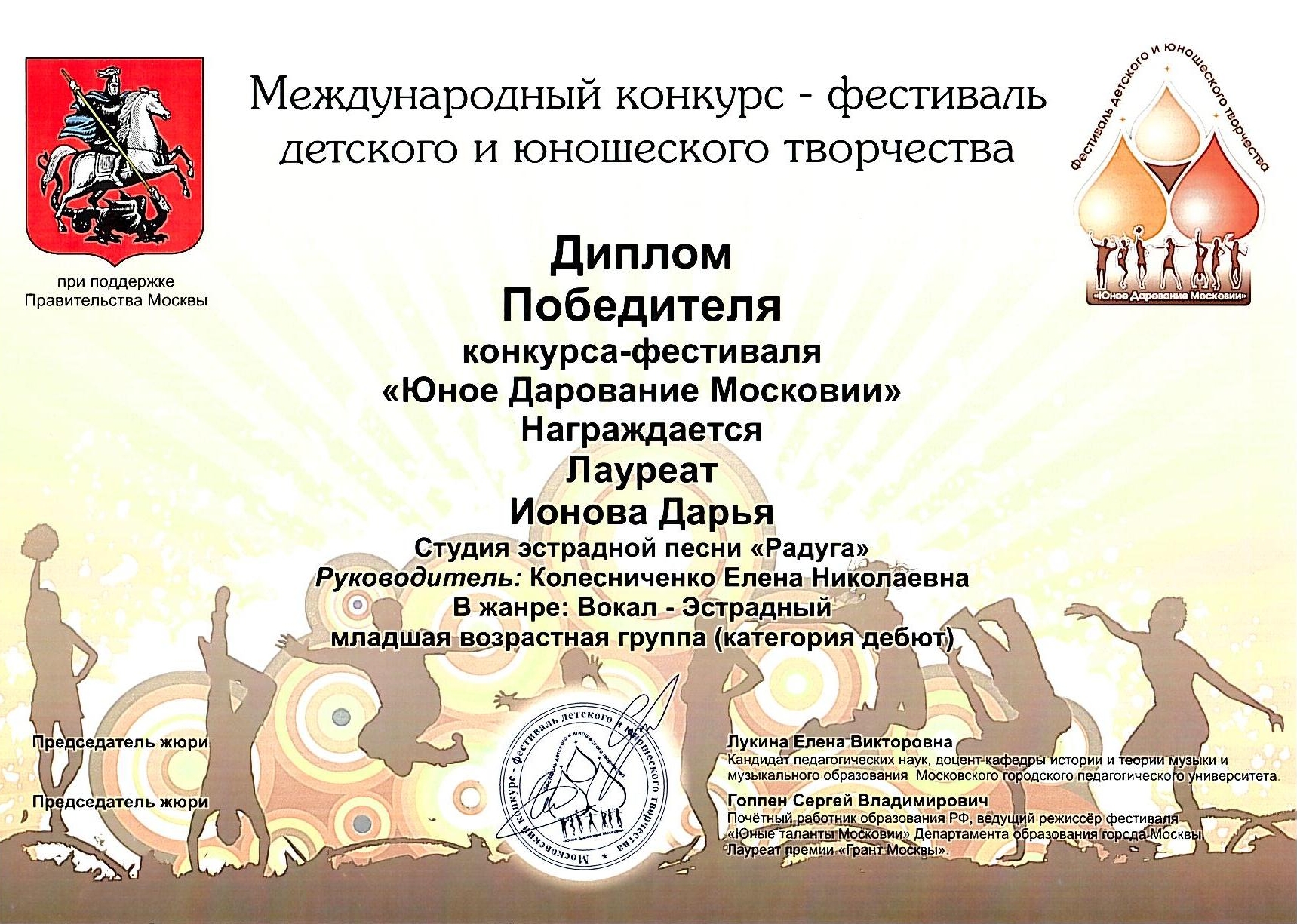 Победитель- Лауреат Международного конкурса "Юное Дарование Московии" Департамента Образования г.Москвы (2013) -Колесниченко Петр