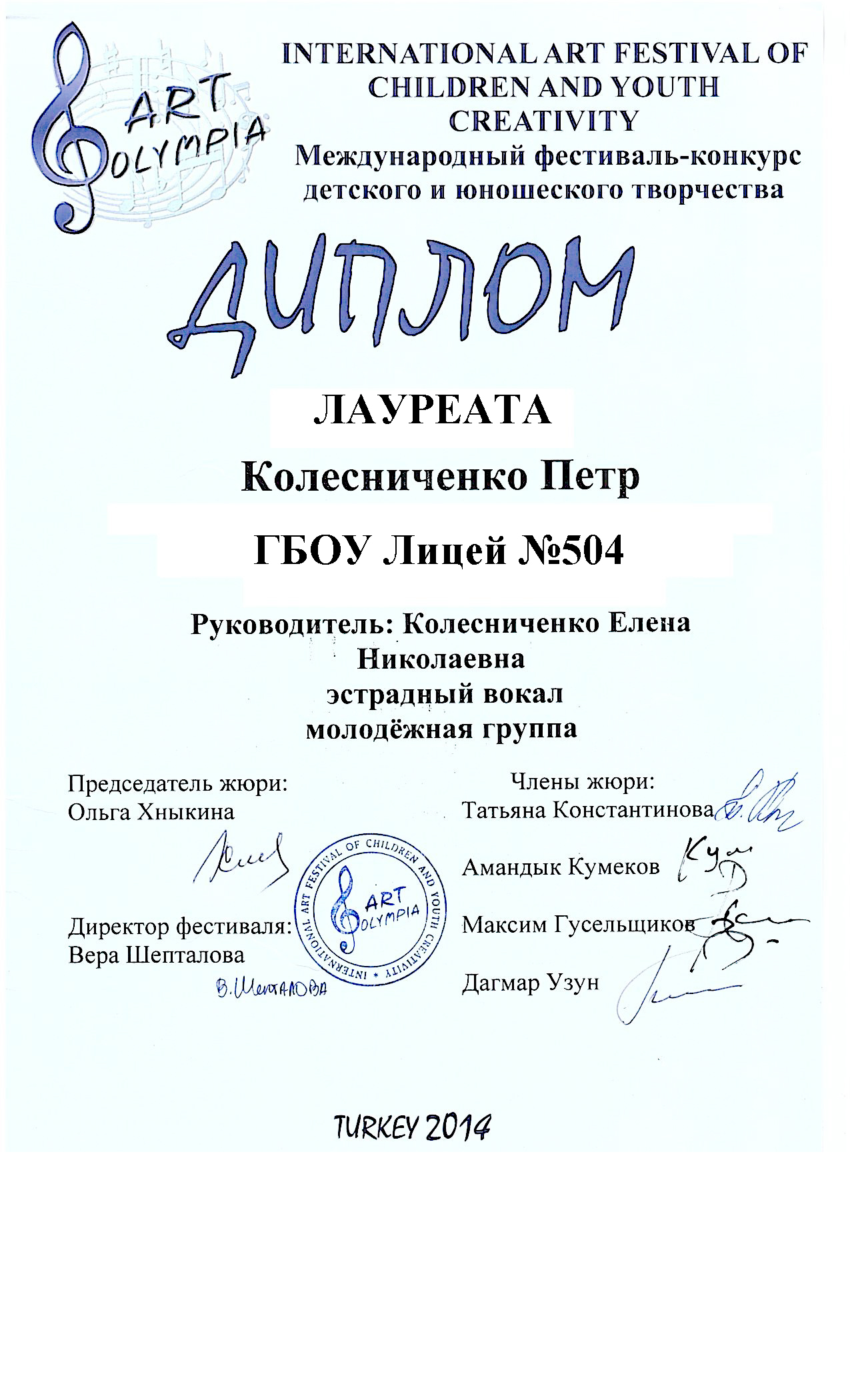 Лауреат (2014) - Международный фестиваль "ART OLIMPIYA" (Турция. Аланья) - Колесниченко Петр.