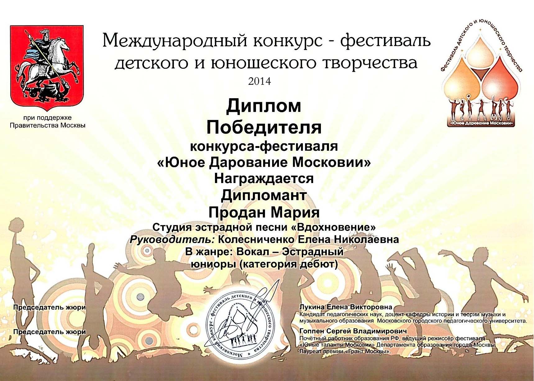 Победители- дипломанты (2014) "Юное дарование Московии" - Савельева Валерия, Пегарева Мария, Продан Мария, Кравченко Анастасия, Митрофанова Александр, Бабенко Дарья, Хромых Ирина.