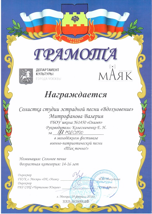 Солисты и ансамбли студии эстрадной песни "Радуга" и "Вдохновение" приняли участие а конкурсе патриотической песни "Так точно!", организованном Департаментом культуры города Москвы, и были награждены кубками и Грамотами Победителей 1-3 степеней.
