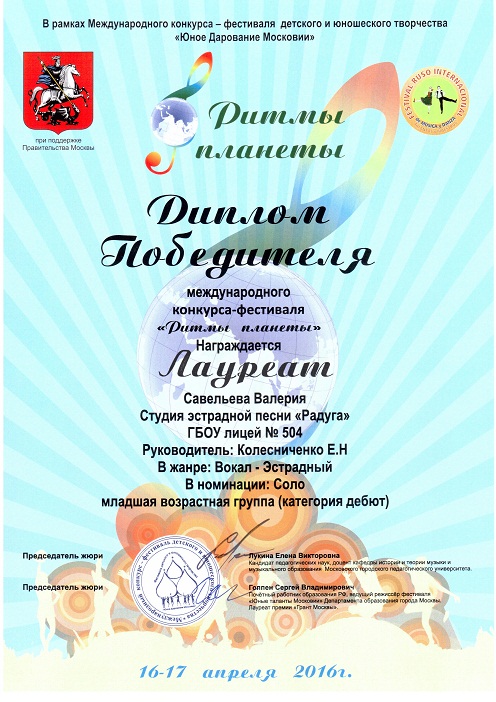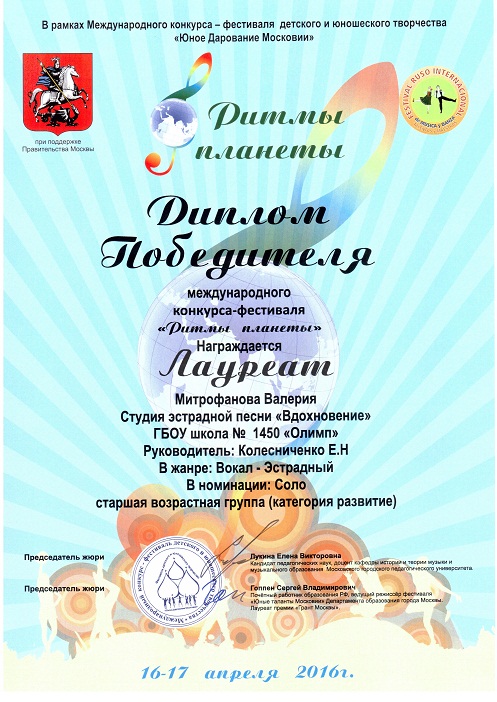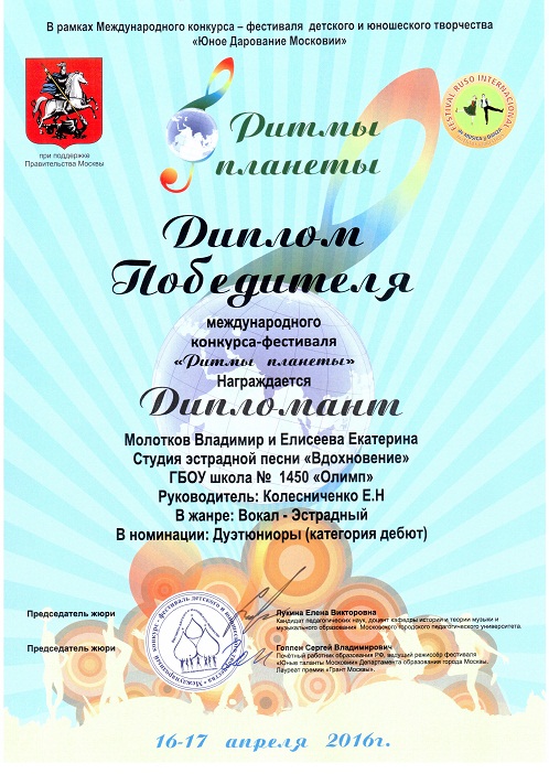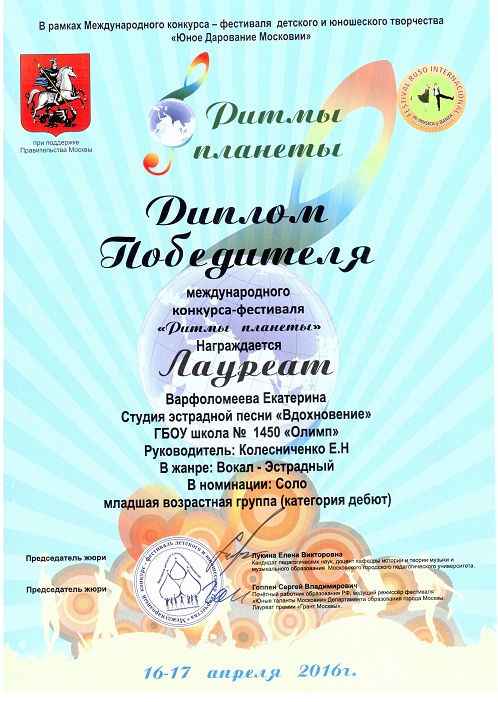 Солисты и ансамбль "Вдохновения" и "Радуги" выступили на Международном конкурсе "Ритмы планеты", в рамках международного фестиваля детского и юношеского творчества "Юное Дарование Московии", и стали Лауреатами и Победителями-дипломантами.