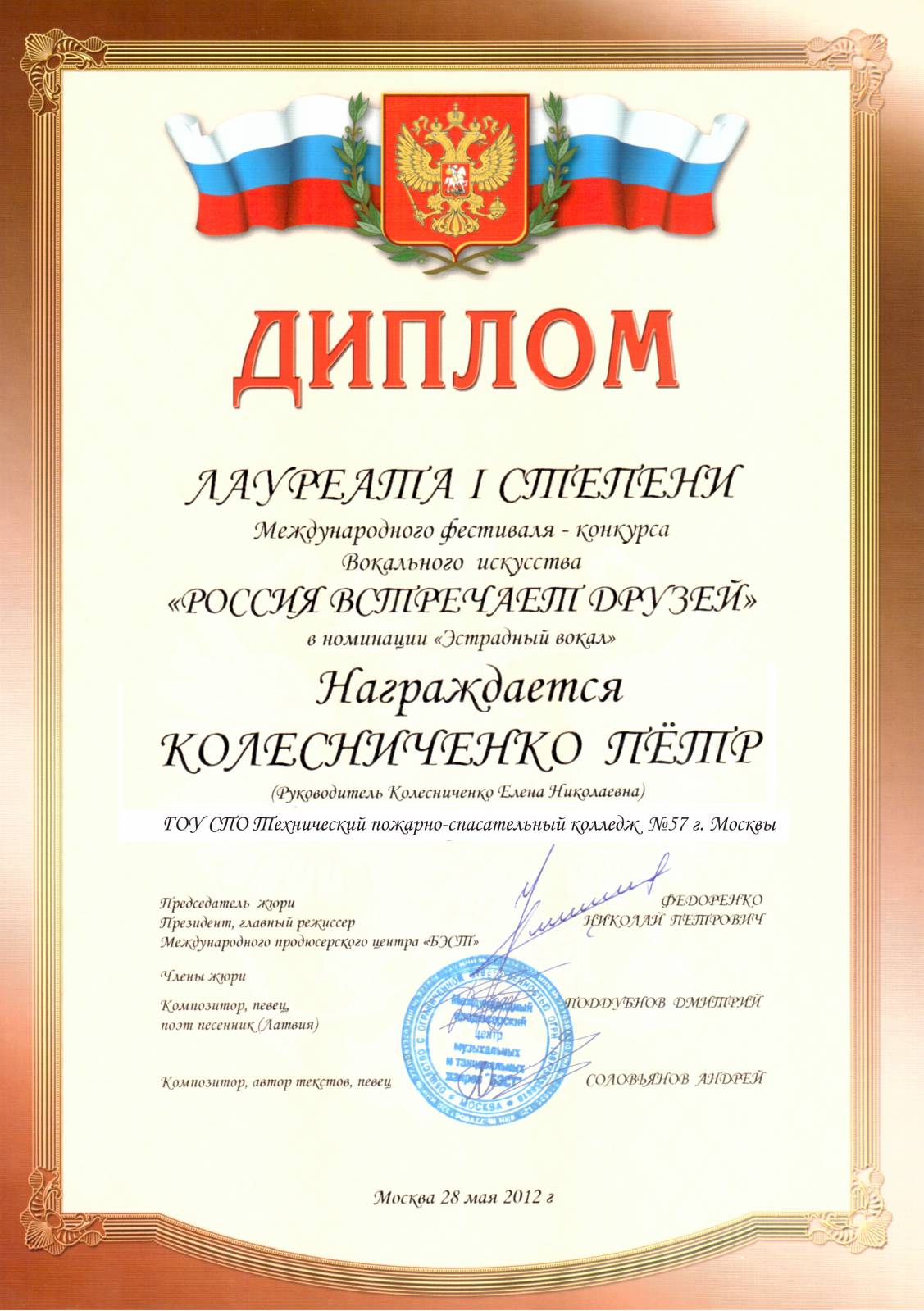 Диплом Колесниченко Пётр [Россия встречает друзей - 2012]